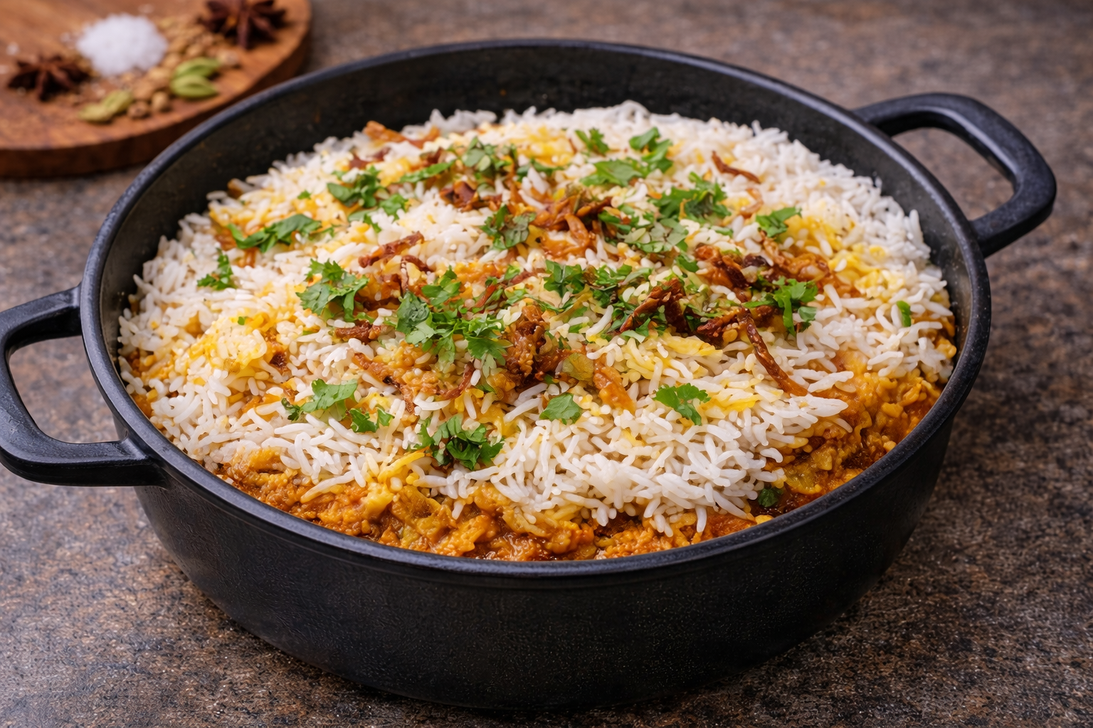 Fish Biryani is a fragrant and flavorful seafood biryani where firm king fish pieces are lightly marinated, gently fried, and then layered with aromatic basmati rice and slow-cooked dum masala. Unlike chicken or beef biryani, fish biryani is lighter, cooks faster, and allows the spices to enhance rather than overpower the fish. Surmai works exceptionally well because it holds its shape, absorbs masala beautifully, and stays moist during dum cooking.