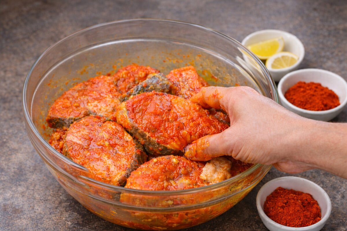 Mix fish with salt, turmeric, chilli powder, lemon juice, ginger-garlic paste, and oil.